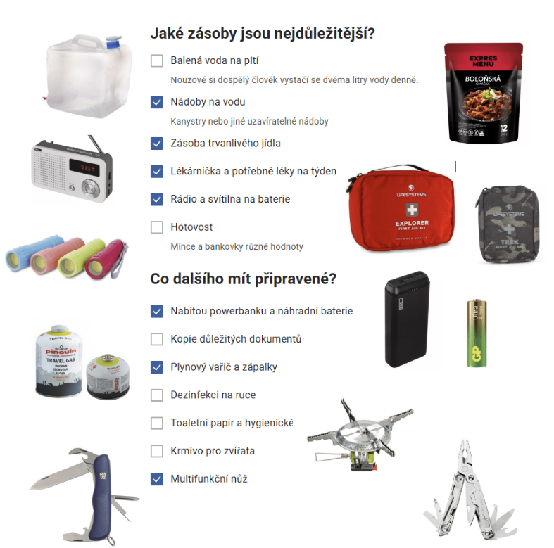 Pokud dojde k výpadku elektřiny nebo zásobování, oceníte trvanlivé jídlo, které nevyžaduje vaření. Vhodné jsou konzervy, instantní pokrmy nebo expediční jídla s dlouhou trvanlivostí. Doporučujeme např. Expres menu označené štítkem 72h.