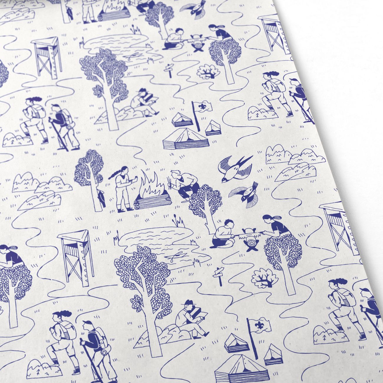 Motiv balicího papíru představuje malebnou cestu do přírody se zobrazením tábořišť, stanů, ohníčků, zvířat a krajiny, které evokují krásné chvíle strávené na táboře.