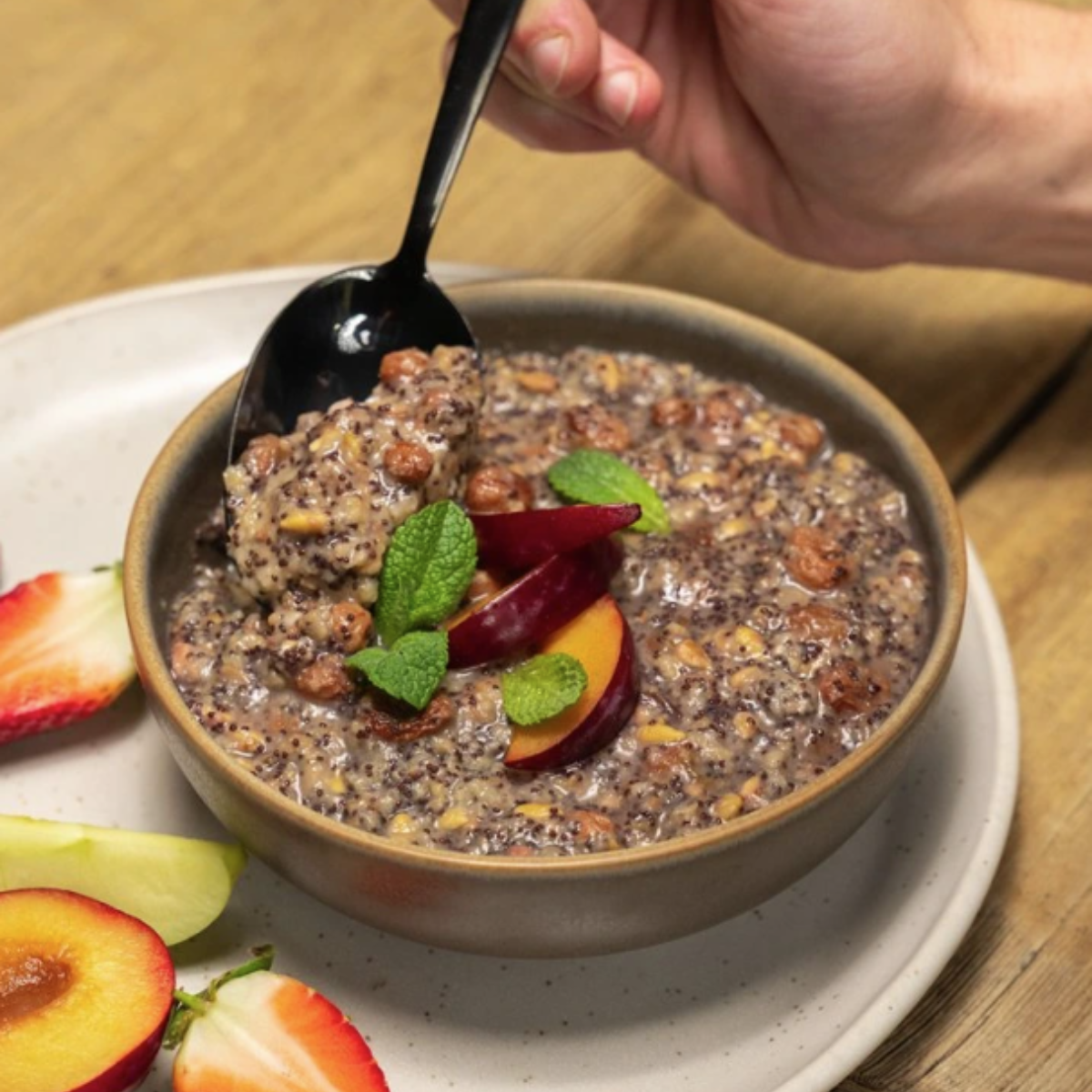 Bohatá maková kaše se švestkami a rozinkami vás pohladí na duši nejen během rána. Chuť je doladěna máslem ghí a špetkou kardamomu.