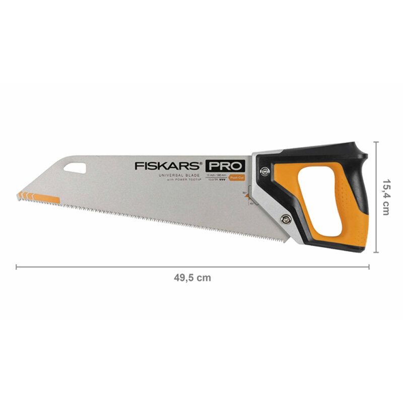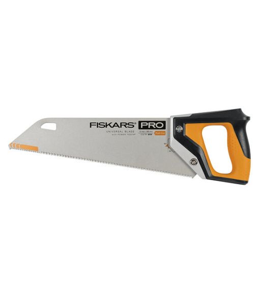 Univerzální ruční pila Fiskars Pro PowerTooth™ je velmi kvalitní a pevná - její celokovové tělo je konstruováno tak, aby vydrželo pády a nárazy. Ergonomický design podporuje různé úchopy a umožňuje práci pod různými úhly. Pilka je vhodná k řezání všech druhů dřeva, laminátu, PVC i dalších materiálů. 380mm čepel je ideální pro práci ve stísněných prostorech.