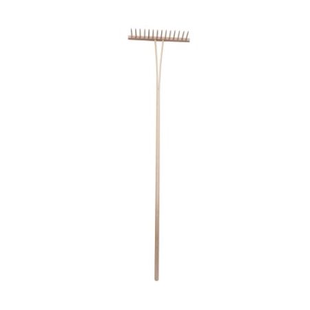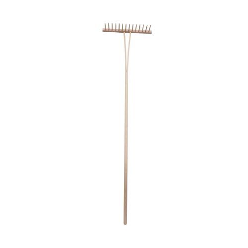 Dřevěné hrábě se 14 dřevěnými kolíky a dřevěnou násadou.