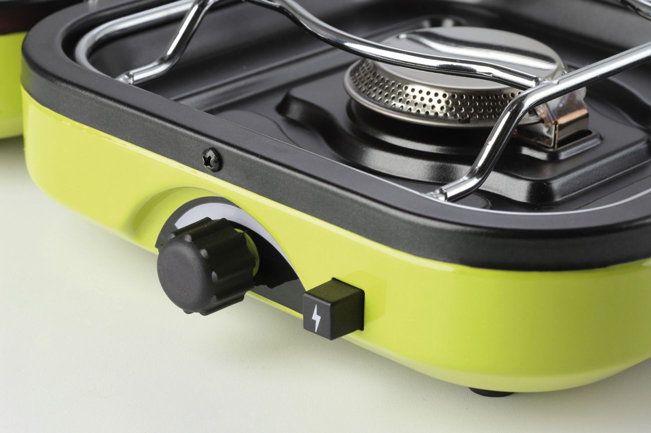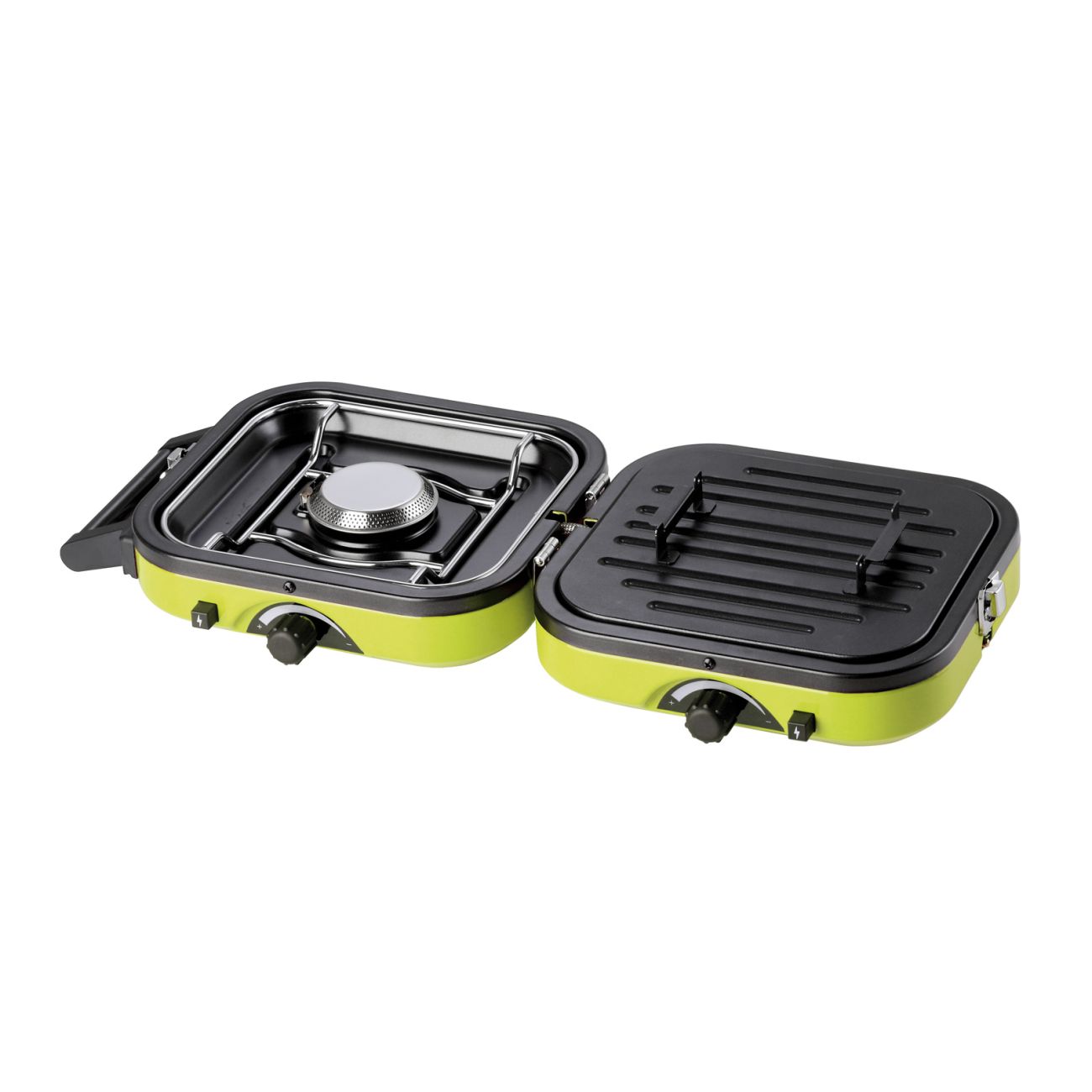 Vařič je vybaven dvěma hořáky s možností složení vařiče pro zajištění kompaktnosti a snadného přenosu. Grilovací plotýnku lze odejmout a obě strany můžete používat jako hořák pro vaření.