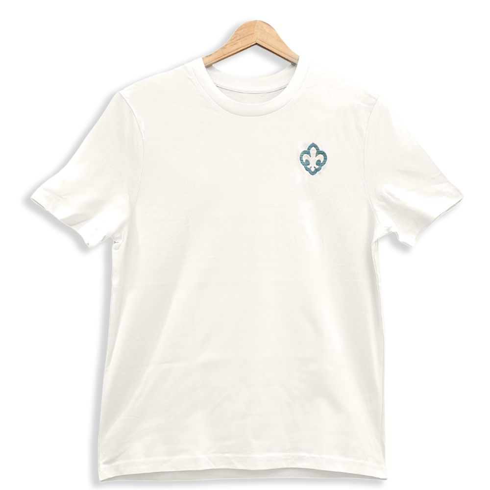 Decentní tričko v jemném krémovém odstínu ozdobené vícebarevnou výšivkou obrysu skautské lilie v modro-zelené kombinaci.