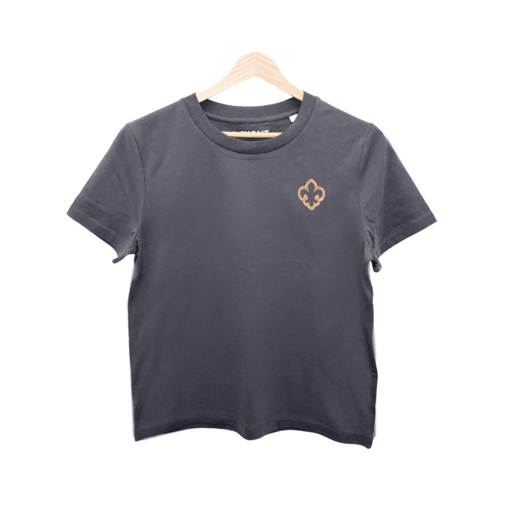 Šedé skautské triko s výšivkou lilie v hnědo-oranžové barvě v dámské variantě.
