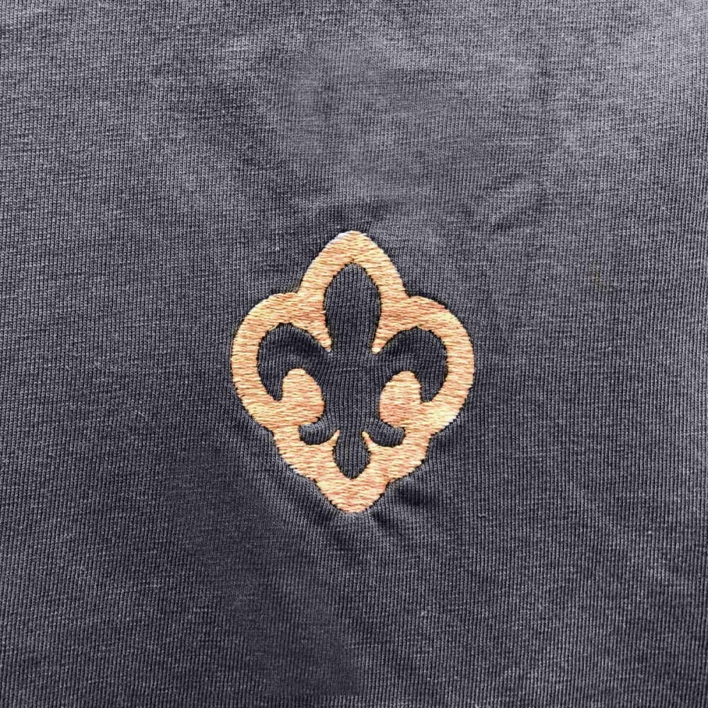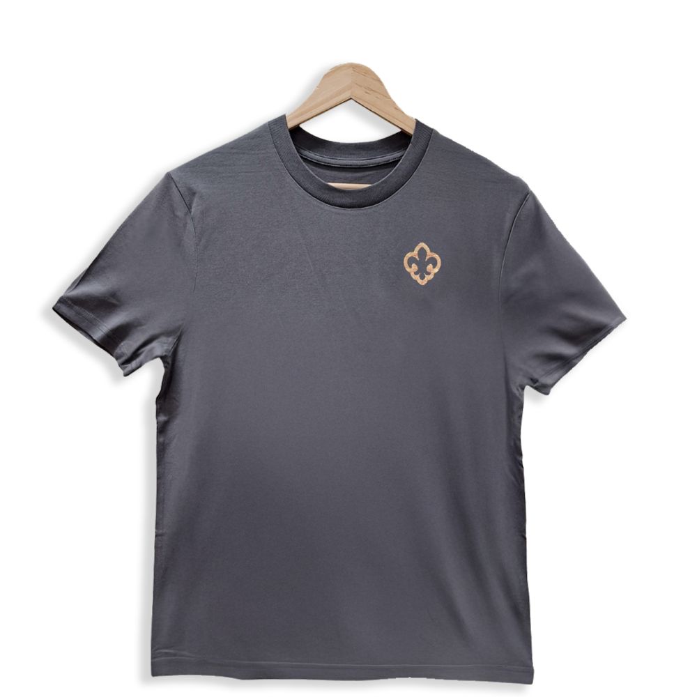 Decentní tričko v univerzální šedé barvě s vícebarevnou výšivkou obrysu skautské lilie v hnědo-oranžové kombinaci.