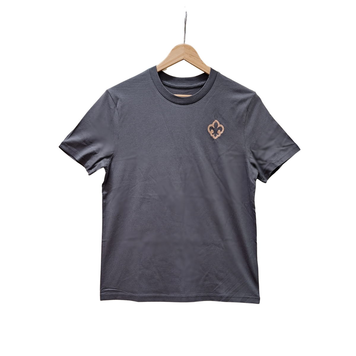 Decentní tričko v univerzální šedé barvě s vícebarevnou výšivkou obrysu skautské lilie v hnědo-oranžové kombinaci.