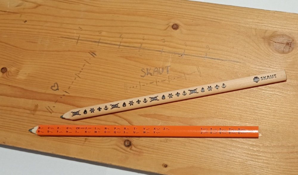 Plochá (tesařská) tužka s "tahákem" na morseovku. Na jedné straně kompletní sada morseovky (písmena), na druhé straně logo SKAUT a "tajná zpráva"